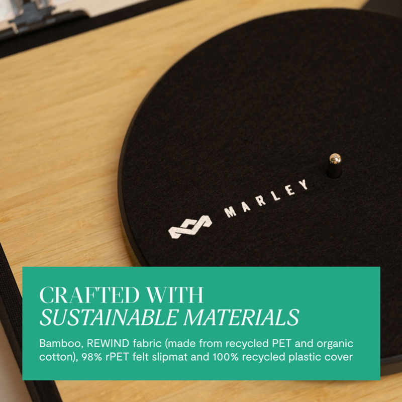 De platenspeler is met zorg gemaakt van bamboe, MDF (een mix van houtvezels en schaafsel) en REWIND™ stof (99% gerecycled van plastic flessen). Deze bundel weerspiegelt Marley's toewijding aan het beschermen van de planeet door ongewenste materialen nieuw leven in te blazen.